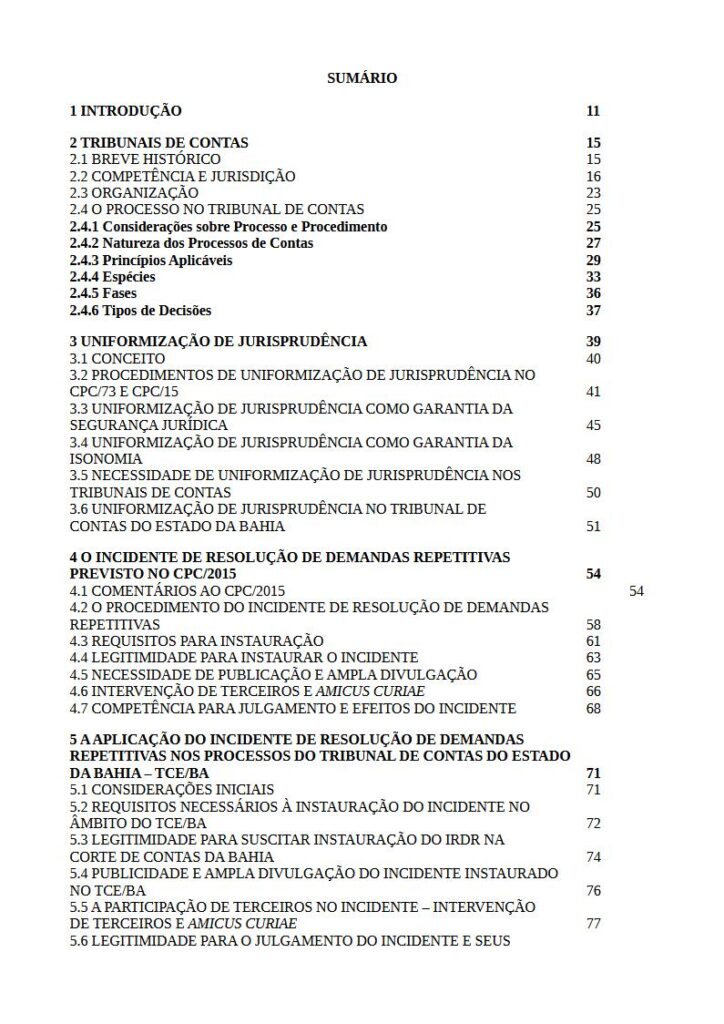 Abaixo o sumário do livro “A aplicação do incidente de resolução de demandas repetitivas no âmbito dos Tribunais de Contas”: